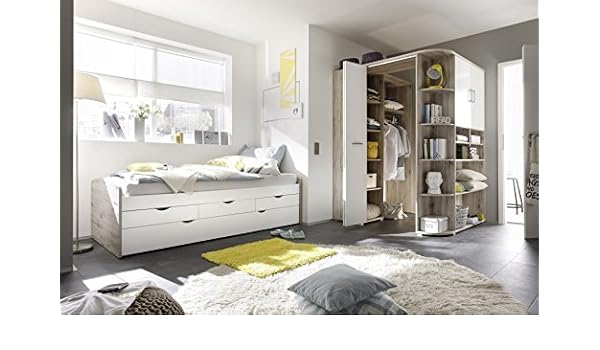 Moebel Guenstig24 De Ausziehbett Eckkleiderschrank Nessi Bett 90cm Einzelbett Schlafzimmer Begehbarer Kleiderschrank 146cm Sandeiche Wei Amazon De Kuche Haushalt
